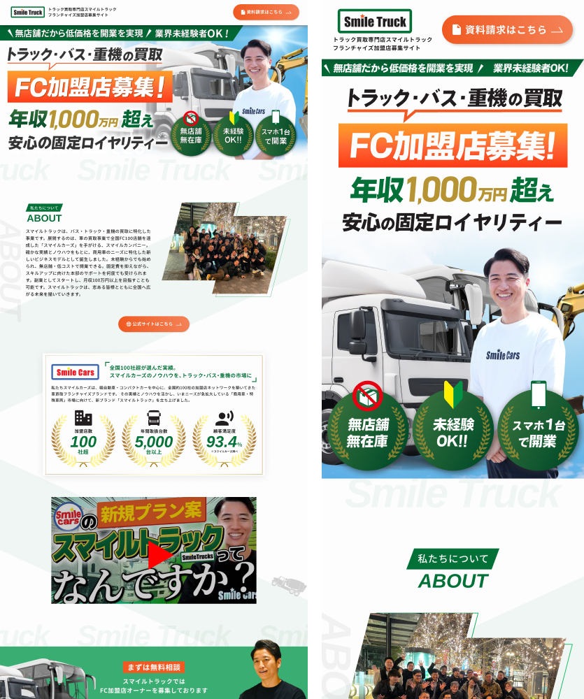 スマイルトラック様が展開する、無店舗・無在庫で始められるトラック・重機・バスの買取フランチャイズ事業の加盟店募集LPを制作いたしました。