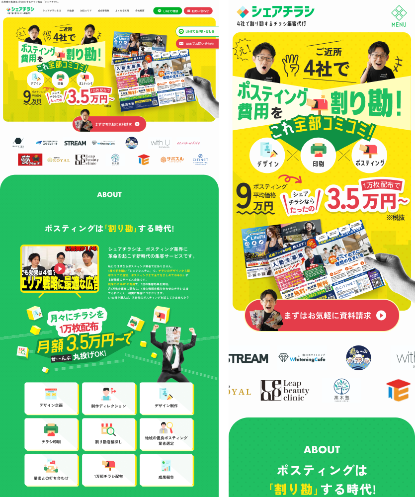 株式会社Design-a様が運営する、4社で割り勘するチラシ集客代行サービス「シェアチラシ」のサービスサイト制作を担当いたしました。