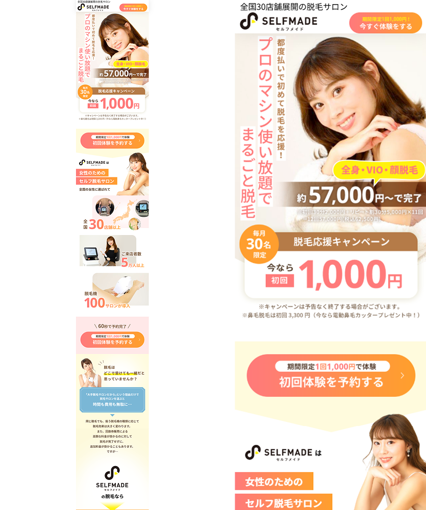 セルフ脱毛サロン「SELFMADE」様の女性向け広告宣伝用LP制作を担当いたしました。