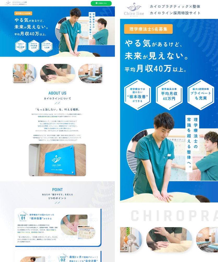 現場の雰囲気や働くスタッフの魅力が伝わるビジュアル表現にもこだわり、ブランドイメージに合わせてトーンを統一。オンライン上でもカイロライン様の魅力がしっかりと伝わる採用サイトへと仕上げています。